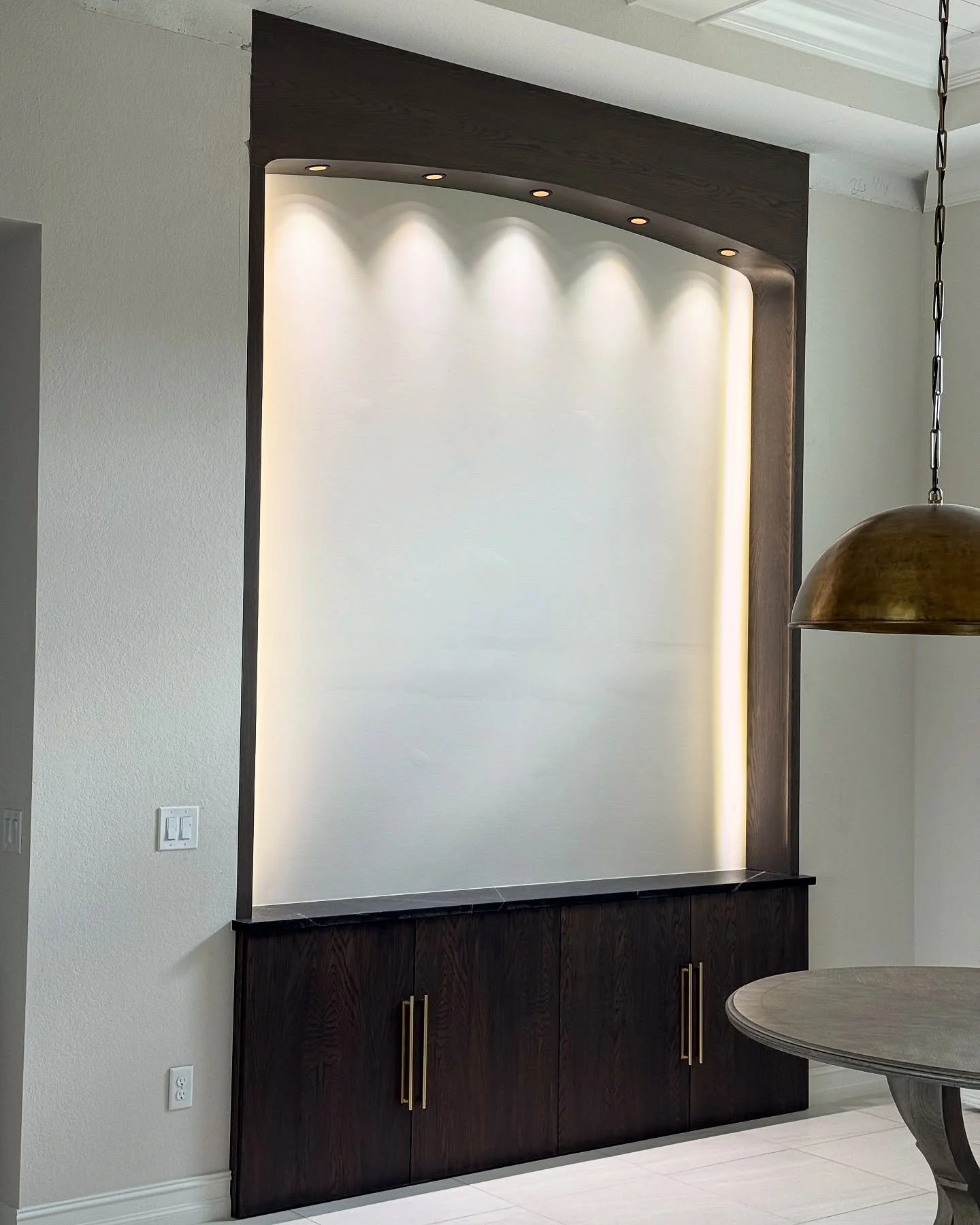 View fullsize Wine bar built in, part two. White Oak arched frame in greystone by @GeneralFinishes 🥳 #winebar